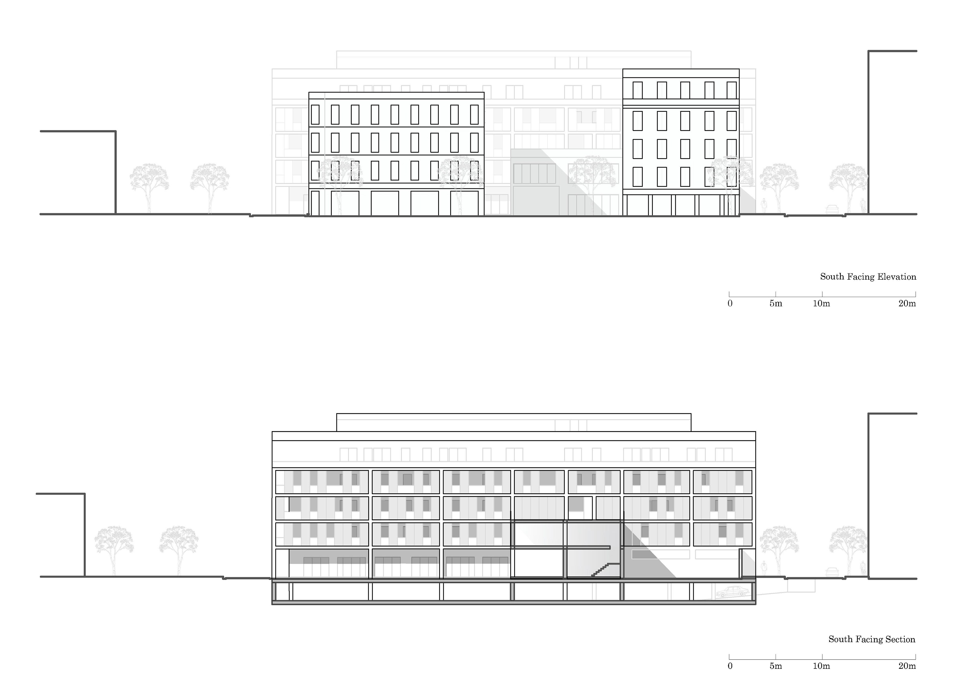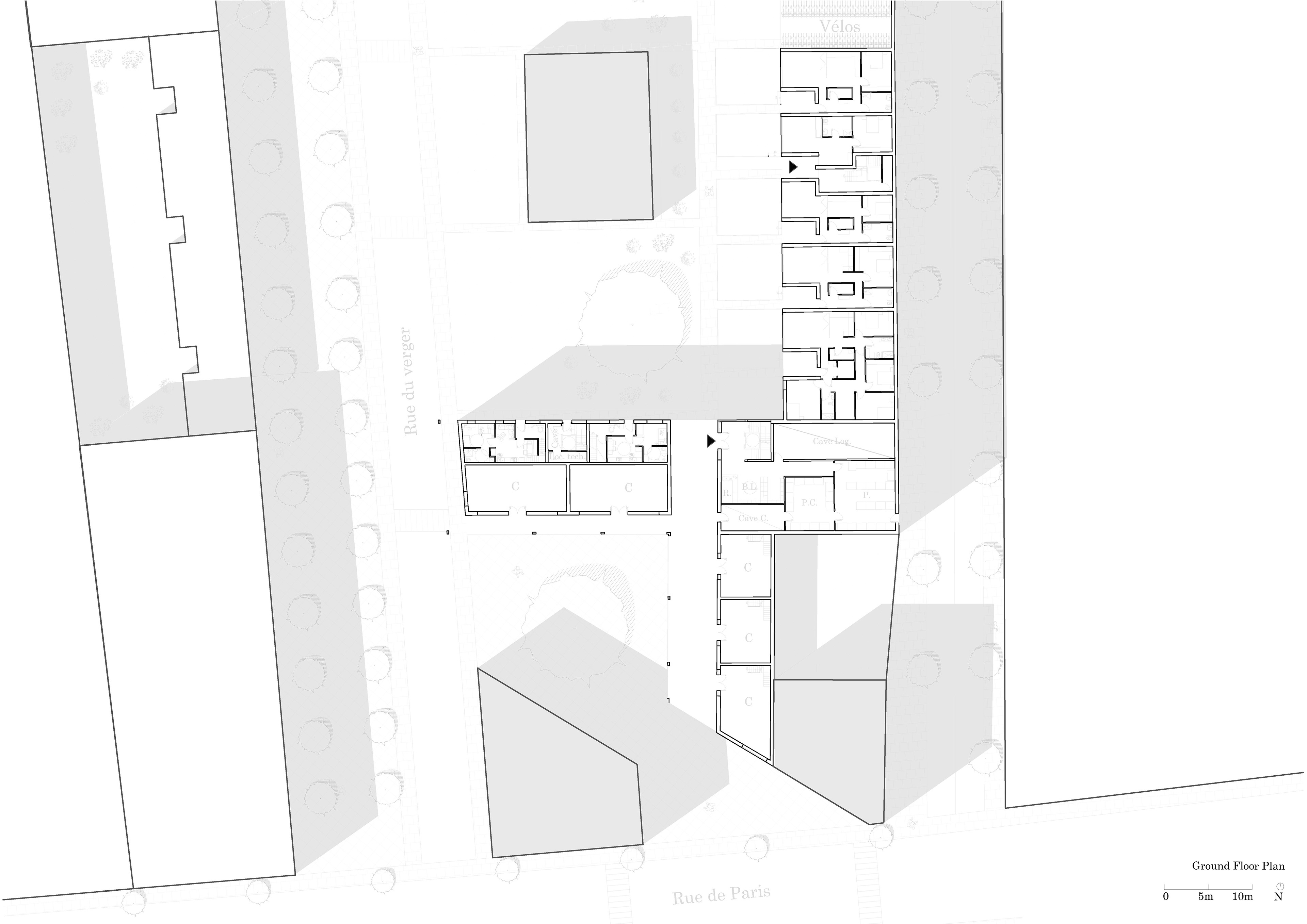 The ‘Rue Verger’, namely ‘Orchard Street’ project foresees a program of urban densification of a one-hectare plot in architectural decay in the Parisian priority suburb of Montreuil, located in the department of Seine-Saint-Denis, in the immediate East periphery of Paris.The masterplan massing originates from the need to create a sense of place, enclosure and belonging, perceived as missing in the neighbourhood, according to the locals. The proposed mixed development project addresses the rapidly growing population in the Île-de-France with collective council housing accessible to all, comprising semi-collective dwellings each with private and shared open spaces. The dwelling units are of average dimensions and cost and showcase attentive consideration of regulation on ‘PLU’ and on access for disabilities. Furthermore the project foresees active fronts with commerce on Orchard Square; an hotel on Rue de Paris; public allotments and greenhouses; municipal equipment on Rue de Verger such as a library with annexed square, nursery, and an extension of the existing theatre with annexed creative hub open to the local youth. This high-density urban design harmonises the design of the new façades with their surroundings, after an inventory of the state of the existing buildings informed which architectural heritage to retain.