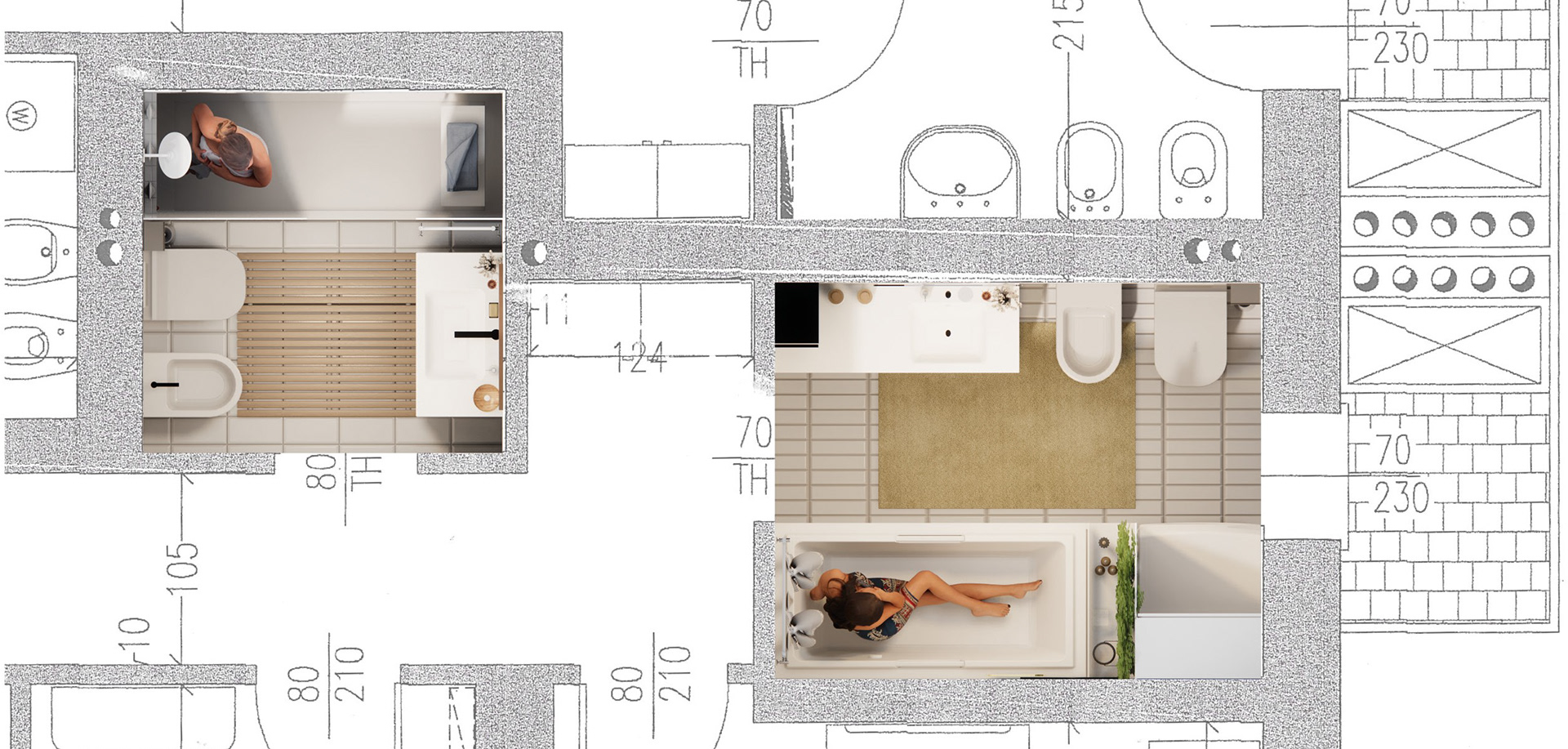 Design Proposal for the renovation of the two bathrooms in a private apartment in Italy using sustainable, budget materials sourced locally.