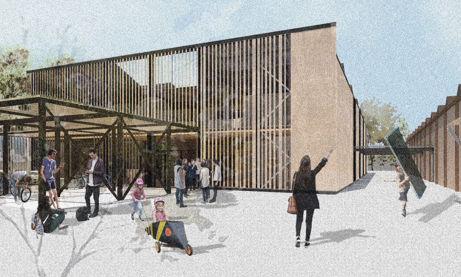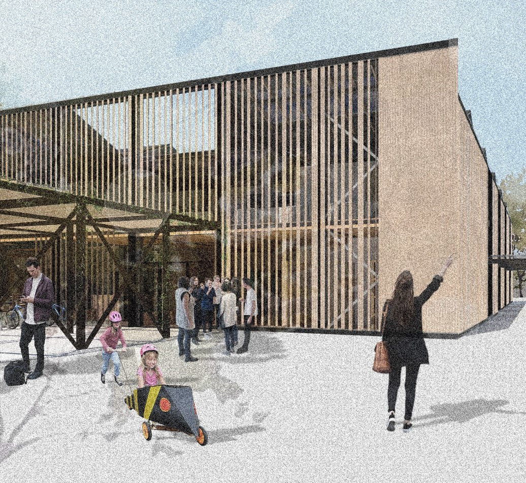 Exterior render of the main entrance of the Institute on the public square.