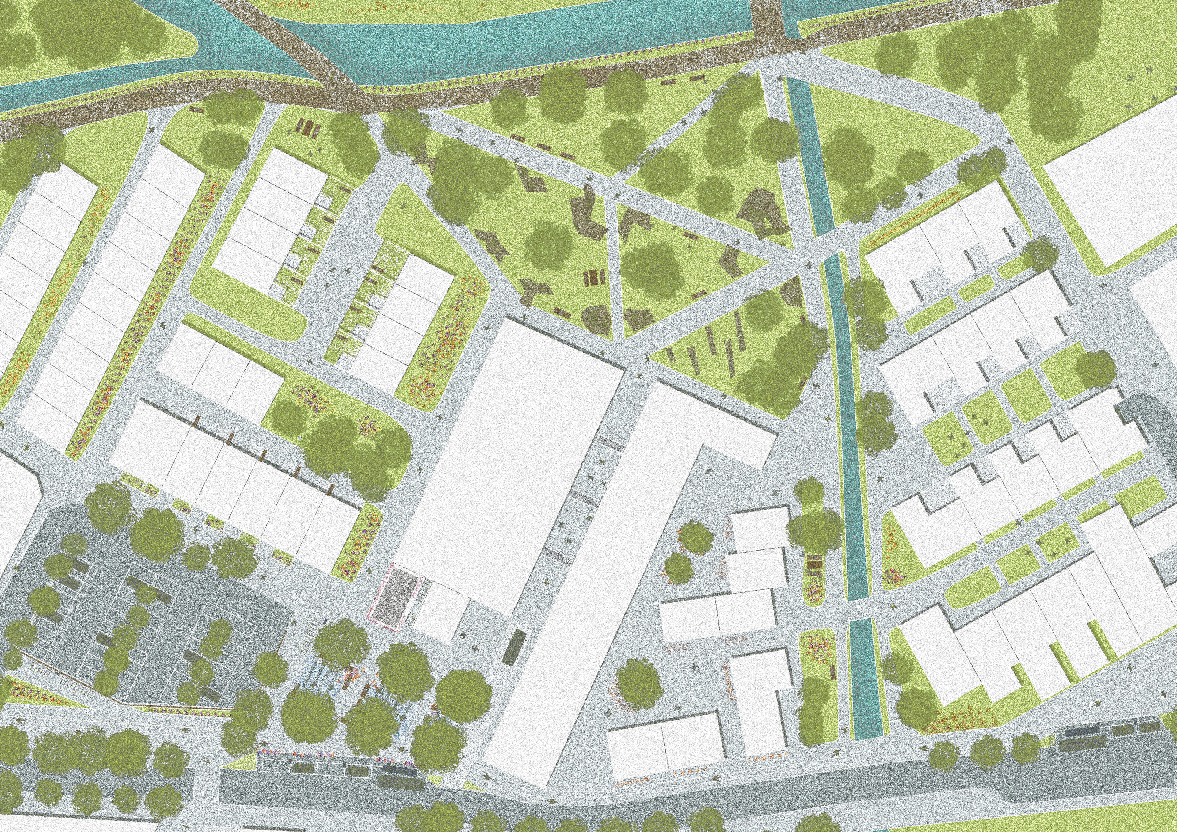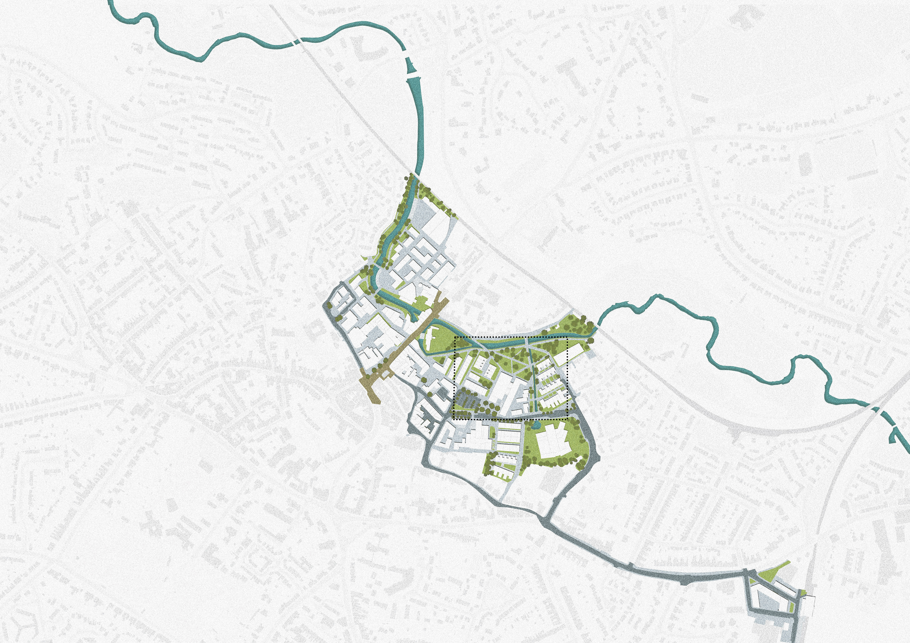 The masterplan of Frome city centre shaped by the enhancement of blue and green corridors punctuated by a series of public buildings.