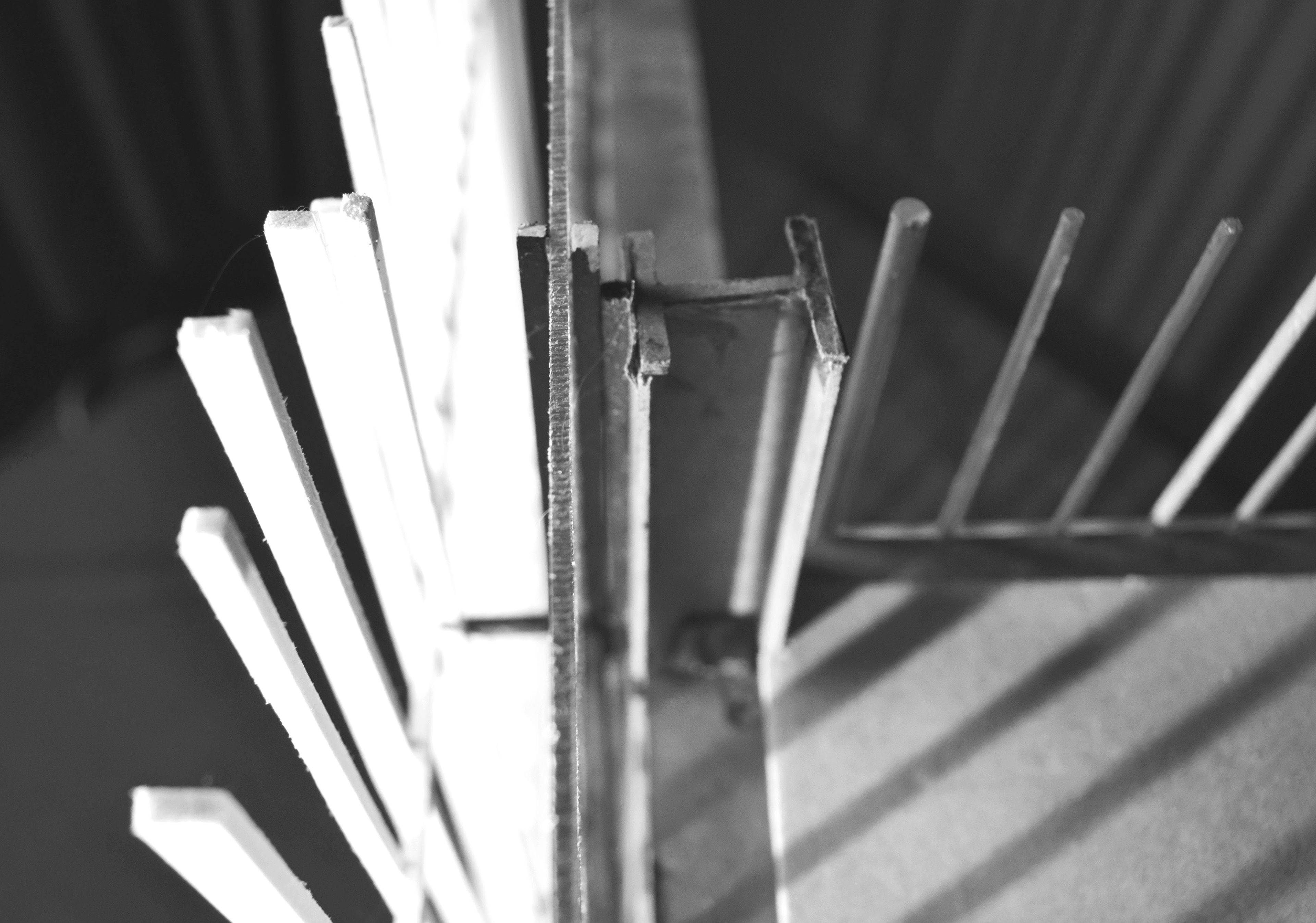 Technical detail model of a fragment of the facade system composed of a loadbearing steel frame, large sliding glass panels and recycled timber louvers.