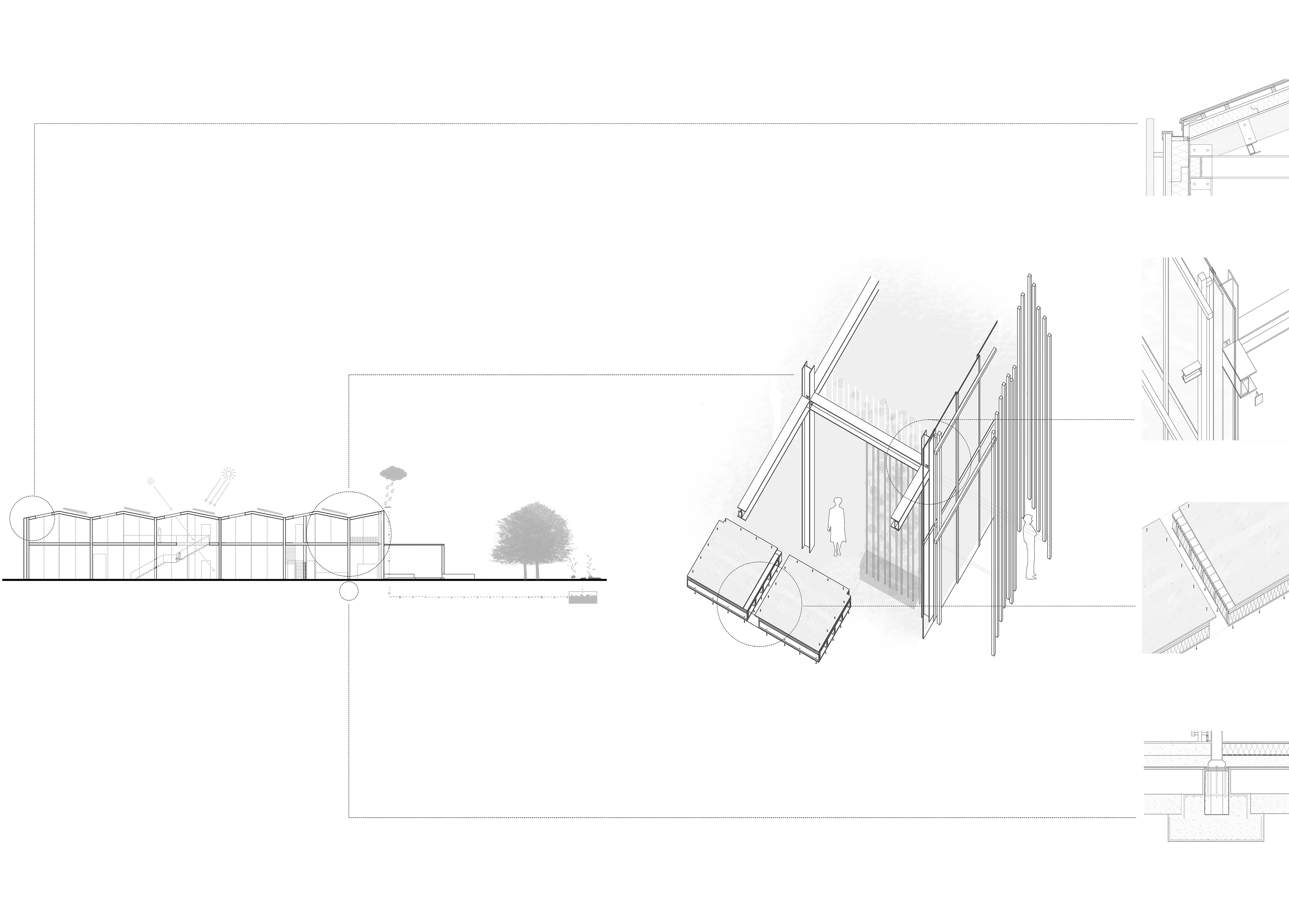 Environmental strategy and roof, glass wall, CLT floor system, strip foundation details.