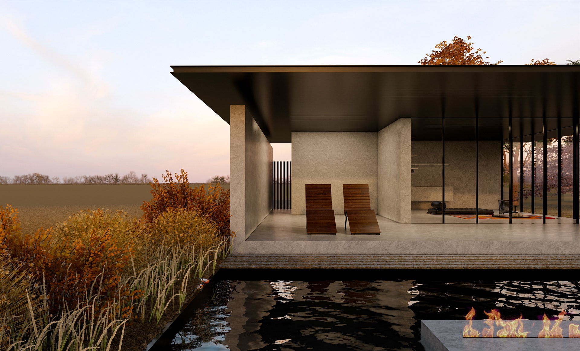 The multifunctional pavilion features an open living area with a kitchenette, a bathroom, and a spacious patio where the client can relax and entertain their numerous visitors. This adaptable space can also accommodate overnight guests. Here, the sunset casts particularly evocative shadows across the living room when it shines from behind the landscaped group of trees adjacent to the villa, entering the living room and casting suggestive long shadows. Elegant lighting enhances the beauty of the trees and villa also at night, making the space equally inviting at different times of the day.